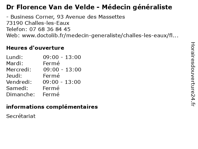 1 Dr Florence Van De Velde - Médecin généraliste (Distance: 0,03 km) 93 Avenue des Massettes, 73190 Challes-les-Eaux consultation, de, docteur, dr, florence, généraliste, medecins, médecin, médecine, palliatifs, polyvalente, rendez, santé, soins, sur, van, velde, vous 3 Maître Florence Aimard - Avocate (Distance: 4,32 km) 2 rue Claude Martin, 73000 Chambéry aimard, avocate, avocats, civils, droits, florence, juridiques, maître 4 Florence Joubert-Couture - Pédicure-podologue (Distance: 4,56 km) 4 Rue Favre, 73000 Chambéry couture, florence, joubert, orthoplastie, podologue, pédicure, pédicurie 5 AXA Assurance et Banque Florence Rebrond (Distance: 4,75 km) 41 Place de la Gare, 73000 Chambéry assurance, assurance appartement, assurance auto, assurance entreprise, assurance epargne, assurance habitation, assurance maison, assurance professionnelle, assurance santé, assurance voiture, axa, banque, et, florence, rebrond 6 |