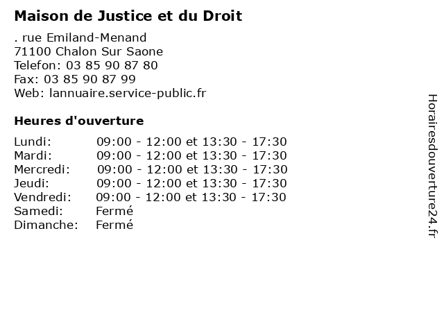 1 Point d'accès au Droit (Distance: 0,13 km) 5 Place de l'Obélisque, 71100 Chalon Sur Saone au, d'accès, droit, point, public, services 2 Jean-Michel Persico & Mathilde Blad-Renard - Huissiers de justice (Distance: 0,27 km) 17 rue de la Banque, 71100 Chalon-sur-Saône blad, citoyen, de, huissier, huissiers, jean, justice, lois, mathilde, michel, persico, renard 3 Bureau d'aide aux victimes - Tribunal de Grande Instance (Distance: 0,00 km) s/n rue Emiland-Menand, 71100 Chalon sur saone administration, aux, bureau, chalon, d'aide, de, du, grande, instance, publics, saone, services, sur, tribunal, victimes 4 Tribunal judiciaire de Chalon-sur-Saône (Distance: 0,00 km) . rue Emiland-Menand, 71100 Chalon-sur-Saône administration, assoc, chalon, de, grande, instance, judiciaire, saône, services, services publics, sur, tribunal 5 Ordre des Avocats - Barreau de Chalon-sur-Saône (Distance: 0,01 km) - Rue Emiland Menand, 71100 Chalon-sur-Saône administration, avocat, avocats, barreau, chalon, de, des, justice, ordre, saône, sur 6 Conseil de Prud'Hommes (Distance: 0,02 km) 4 Rue Emiland Menand, 71100 Chalon Sur Saone administration, assoc, chalon, conseil, de, prud'hommes, saone, services, services publics, sur |