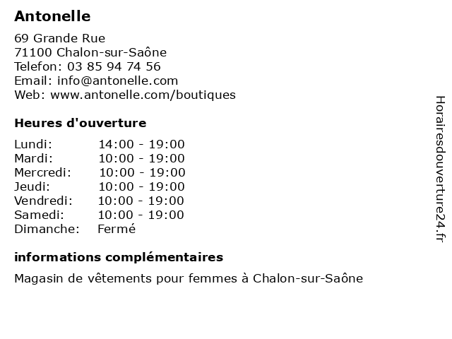 1 Antonelle (Distance: 53,33 km) 88 Rue Carnot, 71000 Macon accessoires, antonelle, divers, habillement, magasins 2 Un Jour Ailleurs (Distance: 0,01 km) 71-73 Grande Rue, 71100 Chalon-sur-Saône accessoires, ailleurs, habillement, jour, mode, pret à porter, un, vetements 3 Opticien Chalon-Sur-Saône | Alain Afflelou (Distance: 0,02 km) 70 Grande Rue, 71100 Chalon-Sur-Saône afflelou, alain, chalon, magasin de lunettes de soleil, magasin d’accessoires de mode, opticien, optométrie, saône, sur 4 Micromania - Zing CHALON SUR SAONE CENTRE - Fermé (Distance: 0,03 km) 59 Grande Rue, 71100 CHALON SUR SAONE centre, chalon, fermé, magasin de jouets, micromania, saone, sur, zing 5 DEVRED 1902 (Distance: 0,03 km) 64 Grande Rue, 71100 Chalon/Saone 1902, devred, fabricant de prêt-à-porter, magasin de chaussures, magasin de smokings, magasin d’accessoires de mode, mode 6 MS Mode (Distance: 0,04 km) 55 Grande Rue, 71100 Chalon-sur-Saône accessoires, chaussures, habillement, mode, ms, pret-a-porter, vetements |