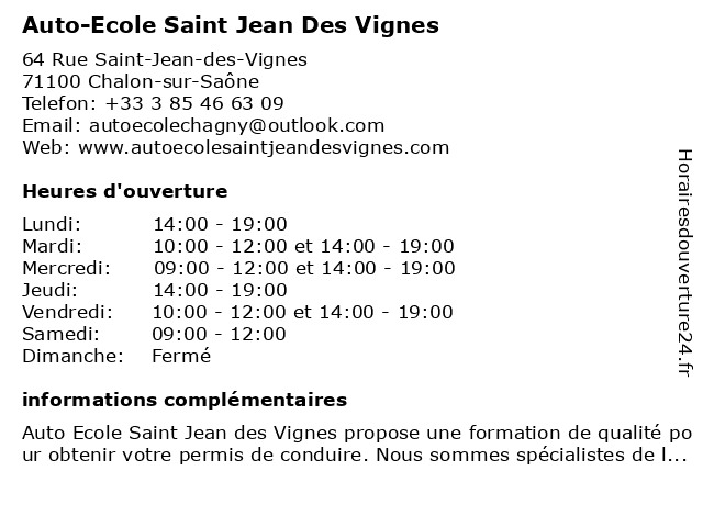 1 Auto-Ecole Saint Jean Des Vignes (Distance: 0,60 km) 28 Rue de la Motte, 71100 Chalon-sur-Saône auto, des, ecole, jean, saint, vignes 2 École primaire publique St Jean des Vignes (Distance: 0,36 km) 19 Rue Général Giraud, 71100 Chalon-sur-Saône des, ecole, education, jean, maternelle, primaire, publique, services, st, vignes, école 3 OPAC Saône et Loire - Bureau local des Prés Saint Jean (Distance: 0,54 km) 49 Rue Edouard Benes, 71100 Chalon-sur-Saône bureau, des, et, jean, local, loire, opac, prés, saint, saône 4 Volaillerie Saint-Vincent (Distance: 0,85 km) 10 Rue Aux Fèvres, 71100 Chalon-sur-Saône boucheries, poissonneries, saint, vincent, volaillerie 5 Cellier Saint Vincent Le (Distance: 0,91 km) 14 Place Saint-Vincent, 71100 Chalon-sur-Saône cellier, le, saint, vincent 6 Bibliotheque des Prés Saint Jean (Distance: 0,93 km) 2 Rue aristide briand, 71321 Chalon sur saone bibliotheque, chalon sur saone, des, jean, prés, saint |