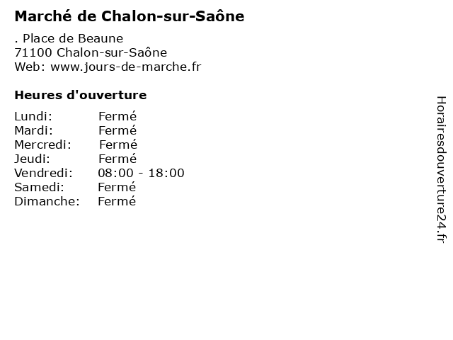1 Marché de Chalon-sur-Saône (Distance: 0,31 km) . Place Saint-Vincent, 71100 Chalon-sur-Saône alimentaire, chalon, de, fleur, habillement, marché, saône, services, sur 2 Marché de Chalon-sur-Saône (Distance: 0,35 km) . Centre Ville, 71100 Chalon-sur-Saône alimentaire, chalon, de, fleur, habillement, marché, saône, services, sur 3 Marché de Chalon-sur-Saône (Distance: 0,35 km) . Place de l'Hôtel-de-Ville, 71100 Chalon-sur-Saône alimentaire, chalon, de, fleur, habillement, marché, saône, services, sur 4 Marché de Chalon-sur-Saône (Distance: 3,82 km) . Rue du Stade, 71100 Chalon-sur-Saône alimentaire, chalon, de, fleur, habillement, marché, saône, services, sur 5 Marché de Chalon-sur-Saône (Distance: 3,96 km) . Colombière, 71100 Chalon-sur-Saône alimentaire, chalon, de, fleur, habillement, marché, saône, services, sur 6 Marché de Saint-Marcel (Distance: 3,28 km) . Place du 19 mars 1962, 01390 Saint-Marcel alimentaire, de, fleur, habillement, marcel, marché, saint, services |