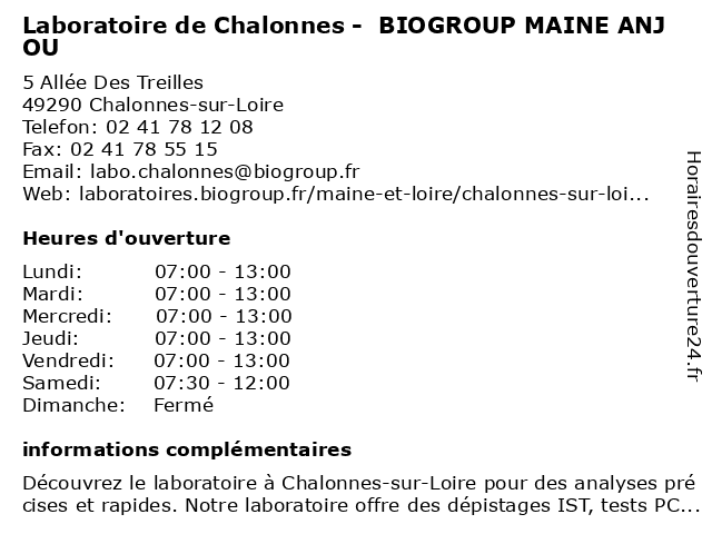 1 LABORIZON MAINE ANJOU - Laboratoire de Chalonnes (Distance: 0,03 km) 5 Avenue Laffon de Ladebat, 49290 Chalonnes-sur-Loire analyse de sang, anjou, chalonnes, coronavirus, covid19, de, laboratoire, laboratoire d analyse médicale, laborizon, maine, prise de sang, résultats, sérologie, test covid, test pcr 2 Destination Anjou Vignobles et Villages (Distance: 0,43 km) - Place de l’Hôtel de Ville, 49290 Chalonnes-sur-Loire anjou, destination, et, guide, information, office, renseignement, tourisme, vignobles, villages 3 Caisse D'Allocations Familiales (CAF) de Maine-et-Loire (Distance: 0,47 km) 4 Rue des Poilus, 49290 Chalonnes-sur-Loire administration, assoc, caf, caisse, d'allocations, de, et, familiales, loire, maine, services, services publics 4 Laboratoire Biomelis (Distance: 0,57 km) 5 Allée, 49290 Chalonnes biomelis, bureau, consultation, dr, laboratoire, maladie, med, médecin, médecine, pratique, thérapie, traitement 5 Laboratoire Biomelis - prélèvements (Distance: 0,57 km) 5 Allée, 49290 Chalonnes biomelis, bureau, consultation, dr, laboratoire, maladie, med, médecin, médecine, pratique, prélèvements, thérapie, traitement 6 École Primaire Publique Le Petit Anjou (Distance: 2,32 km) 26 Rue du 19 Mars 1962, 49290 Mauges-sur-Loire anjou, cours, education, le, petit, primaire, publique, services, école |