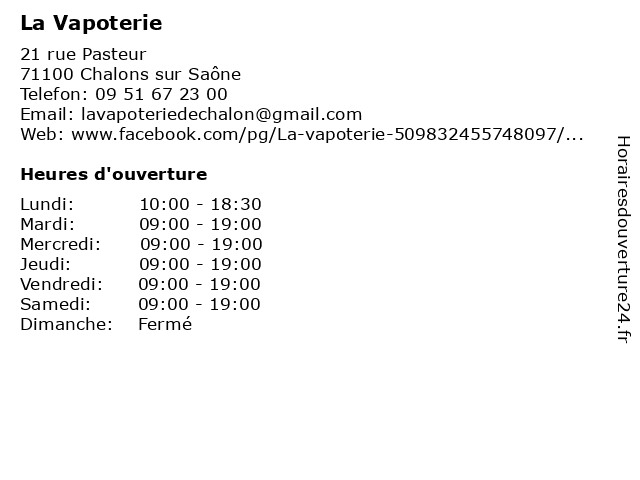 1 Daze Vapor House (Distance: 0,15 km) 31 Grande Rue Saint-Cosme, 71100 Chalon-sur-Saône cigarettes, daze, e-liquide, electronique, electroniques, house, store, vape, vapor, vapote, vapoteur 2 Air & Smart (Distance: 0,26 km) 11 Rue du général Leclerc, 71100 Chalon-sur-Saône air, cigarette, cigarettes, e-liquide, electroniques, smart, vapotage, vapote, vapoteur, électronique 3 Vapostore (Distance: 0,48 km) 63 Grande Rue, 71100 Chalon-sur-Saône cigarette, cigarettes, e-liquide, electroniques, vapostore, vapotage, vapote, vapoteur, électronique 4 Euromaster Chalon S/Saône (Distance: 3,17 km) Rue Pierre de Coubertin, 71100 CHALON SUR SAÔNE batterie voiture, centre auto, chalon, essuie glace, euromaster, garage, garage auto, garage automobile, garagiste, liquide de frein, parallélisme, plaquette de frein, pneu, pneu 4 saisons, pneu hiver, pneu michelin, pneu pas cher, pneus, pneus pas cher, pneus pas chers, pression pneu, promo pneu, recharge clim voiture, revision voiture, s/saône, vidange, vidange voiture 5 La Vapoterie Creusotine (Distance: 32,43 km) 26 rue Maréchal Leclerc, 71200 Le Creusot boutique, creusotine, e-cigarettes, la, liquide, vapoterie, électronique 6 Bourgogne Vap (Distance: 34,73 km) 6 C route de Pagny, 21250 Seurre bourgogne, boutique, e-cigarettes, liquide, vap, électronique  |