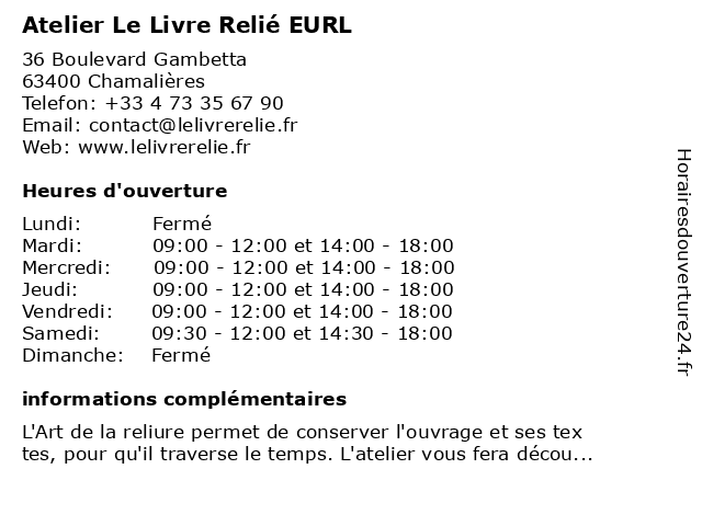 | Samedi | 09:30-12:00 et 14:30-18:00 |
