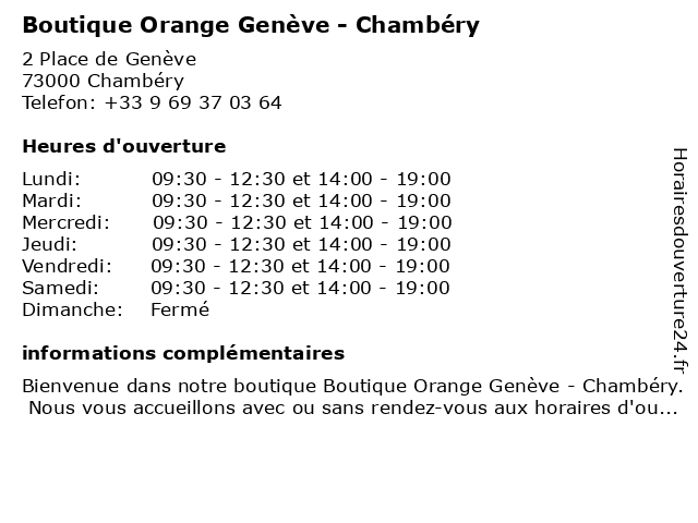 2 Boutique Orange Centre - Chambéry (Distance: 0,00 km) 2 Place de Genève, 73000 Chambéry boutique, centre, chambéry, orange 3 Orange Money - Ma Tabatière (Distance: 0,73 km) 6 Avenue de Merande, 73000 Chambéry argent, ma, money, orange, tabatière, transfert, virement 4 Orange (Distance: 1,98 km) 21 rue Centrale, 73000 Bassens accessoires de téléphonie mobile, boutique de téléphonie mobile, communications mobiles, contrats de téléphonie mobile, orange, téléphone portable 5 Orange (Distance: 2,07 km) - Avenue des Landiers, 73000 Chambéry accessoires, box, internet, mobile, orange, téléphonie 6 Boutique Orange Chamnord - Chambéry (Distance: 3,25 km) Avenue des Landiers, 73000 Chambéry boutique, chambéry, chamnord, orange |