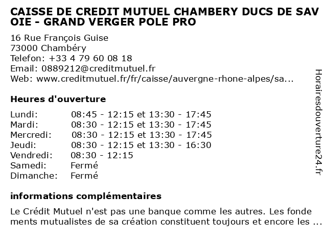 Termes de recherche pour CAISSE DE CREDIT MUTUEL CHAMBERY DUCS DE SAVOIE - GRAND VERGER POLE PRO:de, chambery, grand, verger, crédit, mutuel, caisse, pro, savoie, ducs, pole |