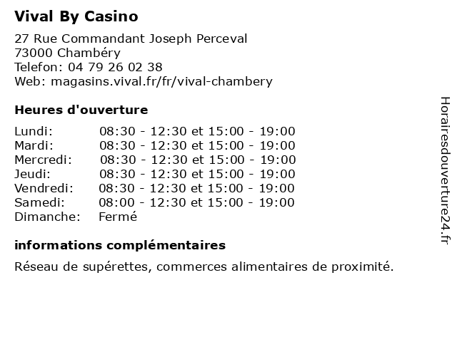 1 Vival by Casino (Distance: 1,39 km) 2 Rue Ernest Grangeat, 73000 Jacob Bellecombette by, casino, droguerie, d’hypermarchés, frais, fruits et légumes, hygiène, parfumerie et autres produits non alimentaires., surgelés, vival, épicerie 2 Vival by Casino (Distance: 4,73 km) 18 Impasse des Eglantines, 73230 Barby alimentation, by, casino, distributeur alimentaire, supermarché, supérette, vival, épicerie 3 Vival By Casino (Distance: 15,06 km) - Chemin des Bateliers, 73100 Aix-les-Bains alimentation, by, casino, distributeur alimentaire, supermarché, supérette, vival, épicerie 4 Vival By Casino (Distance: 19,47 km) 12 Place Centrale, 73330 Le-Pont-de-Beauvoisin alimentation, by, casino, distributeur alimentaire, supermarché, supérette, vival, épicerie 5 Casino Shop (Distance: 0,14 km) 5 Place de la Gare, 73000 Chambéry casino, hypermarches, magasins, shop, supermarches, supermarché 6 Day by Day (Distance: 0,73 km) 52 Rue d'Italie, 73000 Chambéry bio, by, day, epicerie, magasins, produits |
