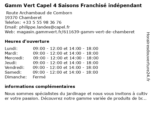 Termes de recherche pour Gamm Vert Capel 4 Saisons Franchisé indépendant:vert, saisons, capel, indépendant, gamm, franchise |