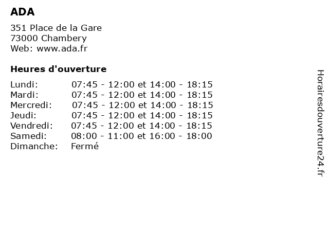 1 Ada (Distance: 0,17 km) 77 Avenue du Maréchal Leclerc, 73000 Chambéry ada, camions, fourgonnettes, location de voiture, monospace, services, véhicules, véhicules utilitaires 2 ADA (Distance: 0,29 km) 71 Quai des Allobroges, 73000 Chambery ada, auto, location de voiture, roulez, vehicules 3 Ada (Distance: 0,40 km) 425 chemin de la Cassine, 73000 Chambéry ada, camions, fourgonnettes, location de voiture, monospace, services, véhicules, véhicules utilitaires 4 Ada (Distance: 12,79 km) 2 Boulevard de Russie, 73100 Aix Les Bains ada, camions, fourgonnettes, location de voiture, monospace, services, véhicules, véhicules utilitaires 5 Ada (Distance: 16,71 km) 415 Avenue J.F Champollion, 38530 Pontcharra ada, agence, location, services, utilitaires, voitures, voyages 6 Ada (Distance: 18,72 km) - Rue Emmanuel Crêtet, 73330 Le Pont de Beauvoisin ada, agence, location, services, utilitaires, voitures, voyages |
