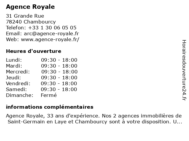 3 Agence Royale (Distance: 10,40 km) 161 Chemin départemental, 78370 Plaisir agence, auchan, aushopping, centre, commercial, plaisir, royale 4 Agence Royale (Distance: 13,70 km) 52 Rue d'Anjou, 78000 Versailles agence, agent, gestion, immobilier, libre, occupe, royale, vente 5 Agence Royale (Distance: 14,91 km) 73 avenue du Général Leclerc, 78220 Viroflay agence, gestion, immobilier, location, royale, vente 6 L'Agence Royale (Distance: 10,40 km) 161 Chemin départemental, 78370 Plaisir cafe, chaussures, enfants, homme, l'agence, mode femme, restaurant, royale, service, sport |