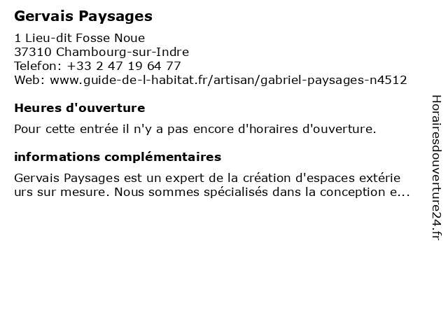 2 Paysages Lochois (Distance: 5,68 km) 47 Rue Henry de lHeritier de Chezelle, 37600 Loches lochois, paysages 4 Sarl gervais maçonnerie (Distance: 33,79 km) Mousseau Ouest, 86220 Les Ormes gervais, maçonnerie, sarl 6 Geosport Paysages Et Clôtures (Distance: 45,58 km) La Gaillardière, 41150 Valloire-sur-Cisse clôtures, et, geosport, paysages |