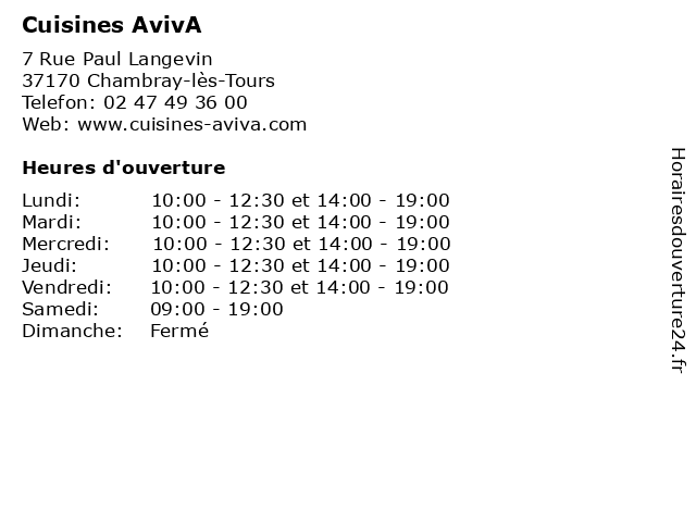 1 Cuisines AvivA Tours (Distance: 0,10 km) 7 Rue Paul Langevin, 37170 Chambray-lès-Tours aviva, conception cuisine tours, cuisine ouverte tours, cuisine tours, cuisine équipée tours, cuisines, cuisiniste tours, devis cuisine tours, installation cuisine tours, magasin cuisine tours, meubles de cuisine tours, réalisation cuisine tours, tours 2 Comera Cuisines (Distance: 0,24 km) 81 rue Charles Coulomb, 37170 Chambray Les Tours comera, cuisines, electromenager, eviers, meubles, robinetterie 3 Cuisines Schmidt (Distance: 0,29 km) 320 Avenue du Grand Sud, 37170 Chambray-les-Tours aménagement, cuisine, cuisines, cuisiniste, intérieur, schmidt, équipement 4 Cuisines SoCoo'c (Distance: 0,76 km) 158 avenue Grand Sud, 37170 Chambray les Tours aménagement, cuisine, cuisines, cuisiniste, intérieur, maison, meubles, socoo'c, équipement 5 Envia Cuisines (Distance: 0,83 km) 6 Rue Michael Faraday, 37170 Chambray-lès-Tours conception, cuisines, envia, équipement 6 |