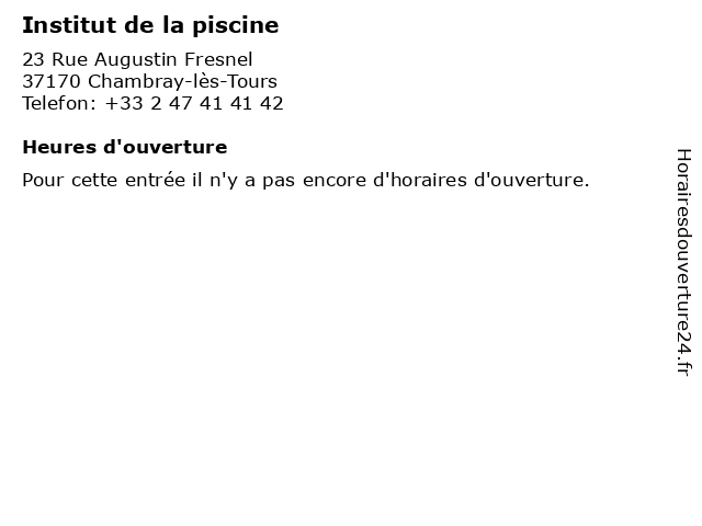 1 Institut de la Piscine (Distance: 2,32 km) 5 Rue Paul Langevin, 37170 Chambray-lès-Tours de, institut, la, piscine 2 Institut de la Piscine (Distance: 9,32 km) 10 Rue Louis Victor de Broglie, 37100 Tours de, institut, la, piscine 3 Piscine municipale - Périodes scolaires (Distance: 1,44 km) - Rue Rolland Pilain, 37170 Chambray les tours activité, bassins, famille, municipale, natation, piscine, périodes, scolaires, sport 4 Piscine municipale - 1ère semaine des petites vacances scolaires (Distance: 1,44 km) - Rue Rolland Pilain, 37170 Chambray les tours 1ère, activité, bassins, des, famille, municipale, natation, petites, piscine, scolaires, semaine, sport, vacances 5 Piscine municipale - 2ème semaine des petites vacances scolaires (Distance: 1,56 km) - Rue Rolland Pilain, 37170 Chambray les tours 2ème, activité, bassins, des, famille, municipale, natation, petites, piscine, scolaires, semaine, sport, vacances 6 Piscine municipale - Période estivale (Distance: 1,56 km) - Rue Rolland Pilain, 37170 Chambray les tours activité, bassins, estivale, famille, municipale, natation, piscine, période, sport |
