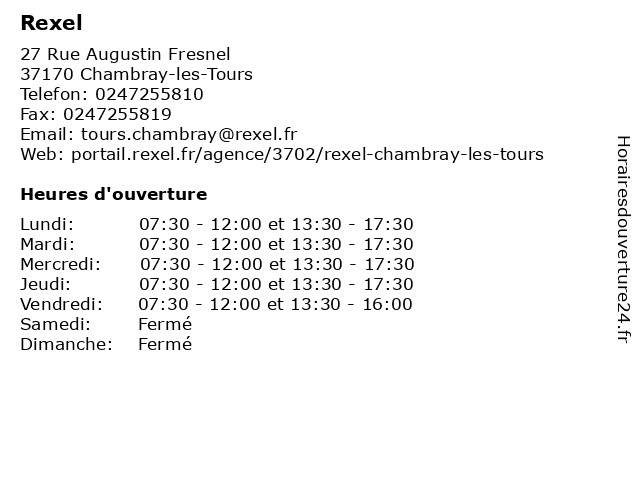 2 4 Rexel (Distance: 57,70 km) 25 Route De La Tuilerie, 41100 Saint-Ouen bricolage, loisirs, rexel, services 5 Rexel (Distance: 59,18 km) 4 Rue Thomas Edison, 86100 Chatellerault bricolage, loisirs, rexel, services 6 Rexel (Distance: 59,79 km) - boulevard des Vallerots, 49400 Saint Lambert des Levées bricolage, loisirs, outillage, rexel, électrique |