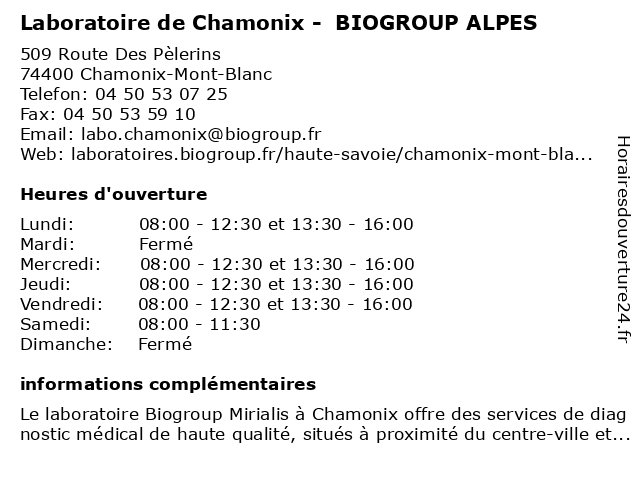 Termes de recherche pour Laboratoire de Chamonix - BIOGROUP ALPES:de, laboratoire, alpes, chamonix, biogroup, dépistages, laboratoire de diagnostic |