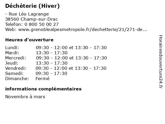 1 Déchèterie (Hiver) (Distance: 4,16 km) - avenue de Provence, 38760 Varces-Allières-et-Risset collecte, déchets, déchèterie, détritus, gravats, hiver, tri 2 Déchèterie (Hiver) (Distance: 5,62 km) - Chemin de Risset, 38640 Claix collecte, déchets, déchèterie, détritus, gravats, hiver, tri 3 Déchèterie (Hiver) (Distance: 6,58 km) 54 avenue de la République, 38130 Échirolles collecte, déchets, déchèterie, détritus, gravats, hiver, tri 4 Déchèterie (Hiver) (Distance: 6,61 km) - Route d'Uriage, 38410 Vaulnaveys-le-Haut collecte, déchets, déchèterie, détritus, gravats, hiver, tri 5 Déchèterie (Hiver) (Distance: 7,73 km) 33 rue des Grands Champs, 38320 Eybens collecte, déchets, déchèterie, détritus, gravats, hiver, tri 6 Déchèterie (Hiver) (Distance: 9,12 km) - rue des Peupliers, 38000 Grenoble collecte, déchets, déchèterie, détritus, gravats, hiver, tri |