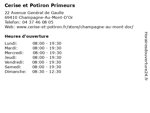 1 Cerise et Potiron Primeurs (Distance: 1,32 km) 4 place de l'Abbé Boursier, 69370 Saint-Didier-au-Mont-d'Or cerise, epicerie, et, fromages, fruits, légumes, potiron, primeurs, vins 2 Cerise et Potiron Primeurs (Distance: 2,22 km) 8 Chemin de pontet et crases, 69130 Ecully cerise, ecully, et, potiron, primeur, primeurs 3 Cerise et Potiron Primeurs (Distance: 3,04 km) 84 rue des Docks, 69009 Lyon cerise, epicerie, et, fromages, fruits, légumes, potiron, primeurs, vins 4 Cerise et Potiron Primeurs (Distance: 3,44 km) 5 Place charles de gaulle, 69130 Ecully cerise, ecully, et, potiron, primeur, primeurs 5 Cerise et Potiron Primeurs (Distance: 4,35 km) 6 Avenue Lamartine, 69260 Charbonnières-les-Bains cerise, epicerie, et, fromages, fruits, légumes, potiron, primeurs, vins 6 Cerise et Potiron Primeurs (Distance: 4,62 km) 15 Promenade des Tuileries, 69160 Tassin la Demi Lune cerise, et, potiron, primeur, primeurs, tassin la demi lune |