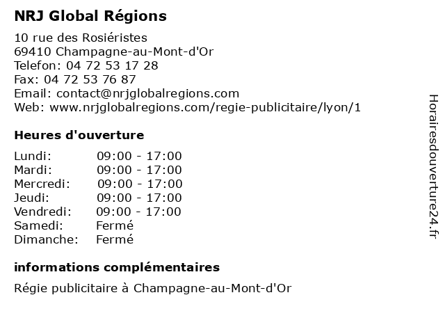 1 NRJ GLOBAL REGIONS LYON (Distance: 0,04 km) 10 Rue des Rosiéristes, 69410 Champagne-au-Mont-d'Or global, lyon, nrj, regions 3 NRJ GLOBAL REGIONS (Distance: 2,78 km) 134 Avenue du 25ème Régiment de Tirailleurs Sénégalais, 69009 Lyon global, nrj, regions 4 Global Knowledge Network France (Distance: 7,53 km) 23 Boulevard Jules Favre, 69006 Lyon france, global, knowledge, network 5 3D Global Dental Solutions (Distance: 9,28 km) 8 Rue Rhonat, 69100 Villeurbanne 3d, dental, dentistes, docteur, global, médecine, santé, solutions 6 Ets Débarras D'embarras( Maison,Caves,Grenier,Appartement,Locaux) Tout La régions 69 and Rhône Loire L'Ain L'Isère (Distance: 13,13 km) 104 Rue Claude Terrasse, 69210 L'Arbresle 69, and, appartement, caves, d'embarras, débarras, ets, grenier, l'ain, l'isère, la, locaux, loire, maison, rhône, régions, tout |