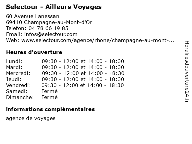 1 Selectour - Ailleurs Voyages (Distance: 2,57 km) 12 Avenue de Veyssière, 69130 Ecully ailleurs, billets de train, selectour, séjours, vols, voyage, voyages 2 Selectour - Ailleurs Voyages (Distance: 5,10 km) 9 Place des Célestins, 69002 Lyon ailleurs, billets de train, selectour, séjours, vols, voyage, voyages 3 Selectour - Ailleurs Voyages (Distance: 5,52 km) 34 Rue Victor Hugo, 69002 Lyon ailleurs, billets de train, selectour, séjours, vols, voyage, voyages 4 Selectour - Ailleurs Voyages (Distance: 6,32 km) 43 Cours Gambetta, 69003 Lyon ailleurs, billets de train, selectour, séjours, vols, voyage, voyages 5 Selectour - Ailleurs Voyages (Distance: 6,80 km) 14 Boulevard Baron du Marais, 69110 Sainte-Foy-lès-Lyon ailleurs, billets de train, selectour, séjours, vols, voyage, voyages 6 Selectour - Ailleurs Voyages (Distance: 8,98 km) 78 Cours Docteur Long, 69003 Lyon ailleurs, billets de train, selectour, séjours, vols, voyage, voyages |