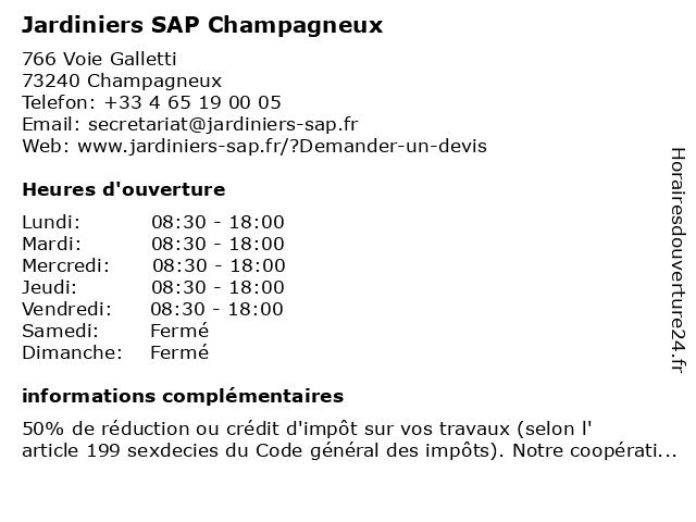 1 Jardiniers SAP Champagneux (Distance: 1,18 km) 16 Chemin de Tire-Bergère, 73240 Champagneux champagneux, jardiniers, sap 2 4 Jardiniers SAP Annecy (Distance: 45,95 km) 18 Avenue du Parc des Sports, 74000 Annecy annecy, jardiniers, sap 5 Jardiniers SAP Sardieu (Distance: 47,43 km) 136 Lotissement Les Lilas, 38260 Sardieu jardiniers, sap, sardieu 6 Jardiniers SAP St Bonnet De Mure (Distance: 51,72 km) 19 Rue Marius Berliet, 69720 Saint-Bonnet-de-Mure bonnet, de, jardiniers, mure, sap, st |