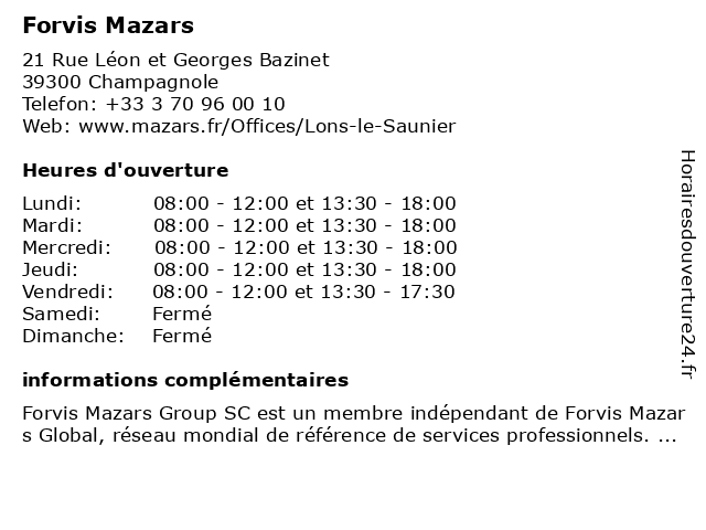 1 Forvis Mazars (Distance: 28,81 km)7 Rue des Perrières, 39000 Lons-le-Saunier forvis, mazars