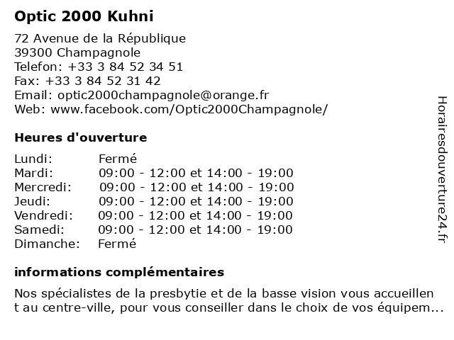 1 Optic 2000 (Distance: 0,04 km) 72 Avenue de la République, 39300 Champagnole 2000, lunettes, optic, santé, solaires 2 Sport 2000 (Distance: 0,43 km) 430 Rue du Village, 39300 Champagnole 2000, course à pied, mode, multisport, sport 3 Sport 2000 Montagne (Distance: 17,12 km) - Chalet, 73700 Arc 2000, course à pied, mode, montagne, multisport, sport 5 Les Opticiens Mutualistes (Distance: 50,00 km) - rue Gagnieres, 39100 Choisey lentilles, les, lunettes, mutualistes, optic, opticien, opticiens, optique, vision 6 Les Opticiens Mutualistes (Distance: 50,05 km) 12 Place Nationale, 39100 Dole lentilles, les, lunettes, mutualistes, optic, opticien, opticiens, optique, vision |