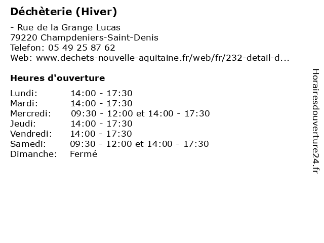 1 Déchèterie (Hiver) (Distance: 11,64 km) - Lieu-dit Gript, 79160 Ardin bennes, collecte, débarras, déchets, déchèterie, hiver, ordures 2 Déchèterie (Hiver) (Distance: 16,19 km) - Rue de Sérigny, 79000 Niort bennes, collecte, débarras, déchets, déchèterie, hiver, ordures 3 Déchèterie (Été) (Distance: 0,00 km) - Rue de la Grange Lucas, 79220 Champdeniers-Saint-Denis bennes, collecte, débarras, déchets, déchèterie, ordures, été 4 Déchèterie (Distance: 5,43 km) - Le Petit Niorteau, 79310 Mazières-en-Gâtine déchèterie, gravats, huiles usées, la réception des déchets et écocentres, les appareils électroménagers, les déchets verts, papier et carton en quantité 5 Déchèterie (Distance: 7,16 km) - La Jallière, 79310 Boissière-en-Gâtine déchèterie, gravats, huiles usées, la réception des déchets et écocentres, les appareils électroménagers, les déchets verts, papier et carton en quantité 6 Déchèterie (Distance: 9,49 km) - lieu-dit Marcilly, 79310 Verruyes bennes, débarras, déchèterie, détritus, ordures, poubelles |