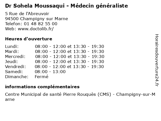 | Mercredi | 08:00-12:00 et 13:30-19:30 |