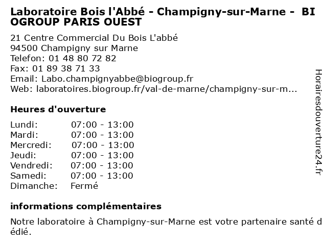 Termes de recherche pour Laboratoire Bois l'Abbé - Champigny-sur-Marne - BIOGROUP PARIS OUEST:sur, bois, marne, champigny, paris, laboratoire, ouest, l'abbé, biogroup, dépistages, laboratoire de diagnostic |