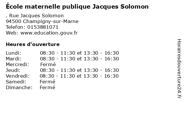 1 École maternelle publique Jacques Solomon (Distance: 12,20 km) 25 Gagnée, 94200 Ivry-sur-Seine ecole, education, jacques, maternelle, publique, services, solomon, école 2 École primaire publique Jacques Solomon B (Distance: 0,05 km) 1 Rue Jacques Solomon, 94500 Champigny-sur-Marne champigny, ecole, education, jacques, marne, maternelle, primaire, publique, services, solomon, sur, école 3 Dr Jacques Samson - Oto-Rhino-Laryngologiste (ORL) (Distance: 4,09 km) 15 Clos des Cascades, 93160 Noisy-le-Grand care, clinic, dentist, dr, france, health, jacques, laryngologiste, orl, oto, rhino, samson, service 4 École élémentaire publique Jacques Solomon (Distance: 12,20 km) 25 Gagnée, 94200 Ivry-sur-Seine ecole, education, jacques, publique, services, solomon, école, élémentaire 5 Valérie Solomon - Hypnothérapeute (Distance: 14,44 km) 7 Rue du Tunnel, 75019 Paris hypno, hypnose, hypnothérapeute, sante, solomon, valérie 6 Orpea Maison De Retraite St Jacques (Distance: 15,28 km) 3 Passage Victor Marchand, 75013 Paris alzheimer, anne, de, jacques, maison, orpea, retraite, sainte, services, soins, st |