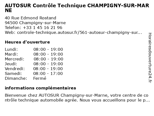 1 AUTOSUR Contrôle Technique CHAMPIGNY-SUR-MARNE - PARC DU PLATEAU (Distance: 2,94 km) 1 Rue du Regard des Luats, 94500 Champigny-sur-Marne autosur, champigny, contrôle, du, marne, parc, plateau, sur, technique 2 Autosur ACTC Auto Contrôle Technique Chennevières Franchisé indépendant (Distance: 5,56 km) 3 Avenue Champlain, 94430 Chennevières-sur-Marne actc, auto, autosur, chennevières, contrôle, franchisé, indépendant, technique 3 AUTOSUR ALFORTVILLE (Distance: 6,00 km) 2 Bis Rue de Charenton, 94140 Alfortville alfortville, autosur 4 AUTOSUR Contrôle Technique CHARENTON-LE-PONT (Distance: 6,27 km) 21 Rue Camille Mouquet, 94220 Charenton-le-Pont autosur, charenton, contrôle, le, pont, technique 5 AUTOSUR MONTREUIL-SOUS-BOIS (Distance: 6,53 km) 133 Boulevard Aristide Briand, 93100 Montreuil autosur, bois, montreuil, sous 6 AUTOSUR NOISY-LE-SEC (Distance: 8,48 km) 30 Rue Paul Vaillant Couturier, 93130 Noisy-le-Sec autosur, le, noisy, sec |