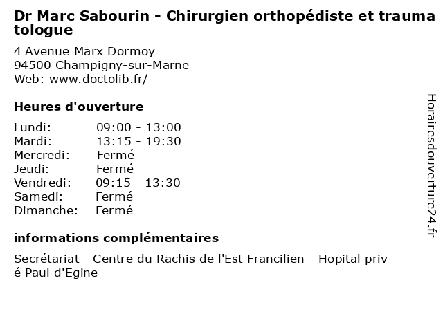 1 Dr Marc Sabourin - Chirurgien orthopédiste et traumatologue (Distance: 2,52 km) 41 Avenue de Bonneuil, 94210 Saint-Maur-des-Fossés chirurgien, consultation, docteur, dr, et, marc, med, médecin, médecine, orthopédiste, sabourin, traitement, traumatologue 2 Edgard Mikaelian - Orthopédiste-orthésiste-podologiste - Secretariat (Distance: 0,01 km) 4 Avenue Marx Dormoy,, 94500 Champigny-sur-Marne edgard, medical, mikaelian, orthopédiste, orthésiste, podologiste, secretariat 3 Dr Jean-Bernard Elis - Chirurgien orthopédiste et traumatologue (Distance: 0,01 km) 4 Avenue Marx Dormoy, 94500 Champigny-sur-Marne bernard, chirurgien, dr, elis, et, jean, orthopedie, orthopédique, orthopédiste, trauma, traumatologie, traumatologique, traumatologue 4 Dr Eric Hassan - Chirurgien orthopédiste et traumatologue (Distance: 0,01 km) 35 Rue de Musselburgh, 94500 Champigny-sur-Marne chirurgie, chirurgien, dr, eric, et, general, hassan, orthopédiste, soins, traumatologue 5 Dr Marc-Olivier Falcone - Chirurgien de la main (Distance: 0,02 km) 4 Avenue Marx Dormoy, 94500 Champigny-sur-Marne chirurgien, de, docteur, dr, falcone, la, main, marc, olivier, sante, soins 6 Dr Marc Tassart - Radiologue (Distance: 0,62 km) 15 Rue Marcel Et Georgette Sembat, 94500 Champigny sur marne dr, marc, médecin, médecine, médical, pharmaceutique, radiologue, tassart, traitement |