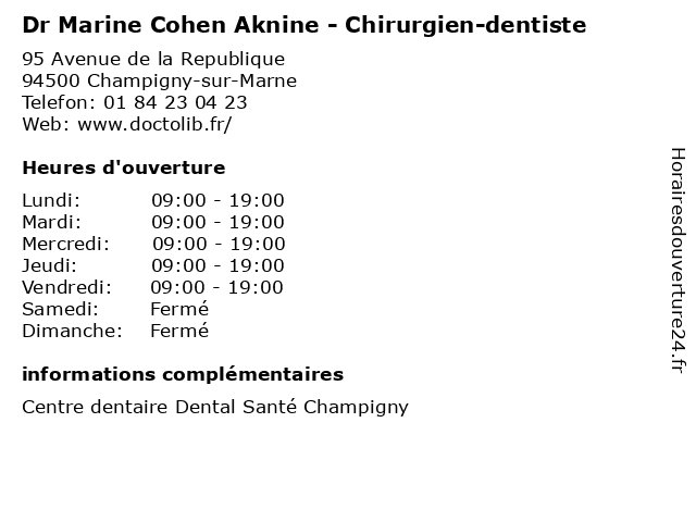 1 Dr Marine Cohen-Aknine - Chirurgien-dentiste - secrétariat (Distance: 0,00 km) 95 Avenue de la République, 94500 Champigny-sur-Marne aknine, chirurgien, cohen, consultation, dentiste, docteur, dr, marine, med, médecin, médecine, secrétariat, traitement 2 Sarl La Roseraie Marine (Distance: 1,10 km) 38 Quai Du Viaduc, 94500 Champigny Sur Marne marine, restaurants, roseraie 3 Dr Marine Besnard - Gastro-entérologue et hépatologue - secrétariat (Distance: 1,73 km) 2 Rue des Pères Camilliens, 94360 Bry-sur-Marne besnard, consultation, docteur, dr, entérologue, et, gastro, hépatologue, marine, med, médecin, médecine, secrétariat, traitement 4 Marine Mogne-Cherel - Ostéopathe (Distance: 2,30 km) 78 Boulevard de Champigny, 94210 Saint-Maur-des-Fossés cherel, marine, mogne, ostéo, ostéopathe, ostéopathes, soins 5 Marine Even - Sophrologue (Distance: 2,49 km) 81 Rue du Général de Gaulle, 94350 Villiers-sur-Marne even, marine, medecin, sante, sophro, sophrologue 6 Marine Jouvet - Psychologue (Distance: 6,24 km) 61 Avenue du Général de Gaulle, 94000 Créteil consultation, docteur, jouvet, marine, med, médecin, médecine, psychologue, traitement |