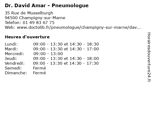 1 Dr David Amar - Pneumologue - secrétariat (Distance: 0,35 km) 35 Rue de Musselburgh, 94500 Champigny-sur-Marne amar, david, dr, médecins, médicaments, pneumologue, santé, secrétariat, spécialiste 2 Dr Raffaele Caliandro - Pneumologue - secrétariat (Distance: 2,69 km) 2 Rue des Pères Camilliens, 94360 Bry-sur-Marne caliandro, consultation, docteur, dr, med, médecin, médecine, pneumologue, raffaele, secrétariat, traitement 3 Dr Julie Obert - Pneumologue - secrétariat (Distance: 2,69 km) 2 Rue des Pères Camilliens, 94360 Bry-sur-Marne consultation, docteur, dr, julie, med, médecin, médecine, obert, pneumologue, secrétariat, traitement 4 Dr Sophie Phin-Huynh - Pneumologue - secrétariat (Distance: 2,69 km) 2 Rue des Pères Camilliens, 94360 Bry-sur-Marne consultation, docteur, dr, huynh, med, médecin, médecine, phin, pneumologue, secrétariat, sophie, traitement 5 Jean Louis David (Distance: 4,53 km) 4 Avenue Victor Hugo, 93360 Neuilly Plaisance beaute, coiffure, david, jean, louis 6 Dr Jacques Foucher - Pneumologue (Distance: 7,99 km) 16 Rue Grande Rue, 93250 Villemomble dr, foucher, jacques, médecins, médicaments, pneumologue, santé, secrétariat, spécialiste |