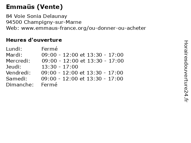 1 Emmaüs (Vente) (Distance: 6,06 km) 38 Avenue Paul Doumer, 93360 Neuilly-Plaisance aide, emmaüs, organisation, services, vente 2 Emmaüs (Vente) (Distance: 9,55 km) 2 Avenue de la Liberté, 95220 Charenton-le-Pont aide, emmaüs, organisation, services, vente 3 Emmaüs (Vente) (Distance: 11,72 km) 42 Pierre et Marie Curie, 94200 Ivry-sur-Seine aide, emmaüs, organisation, services, vente 4 Emmaüs (Dépôt) (Distance: 0,00 km) 84 Voie Sonia Delaunay, 94500 Champigny-sur-Marne aide, dépôt, emmaüs, organisation, services 6 Bureau de vente Nexity (Distance: 2,07 km) Place du commerce, 93160 NOISY-LE-GRAND bureau, de, nexity, vente |