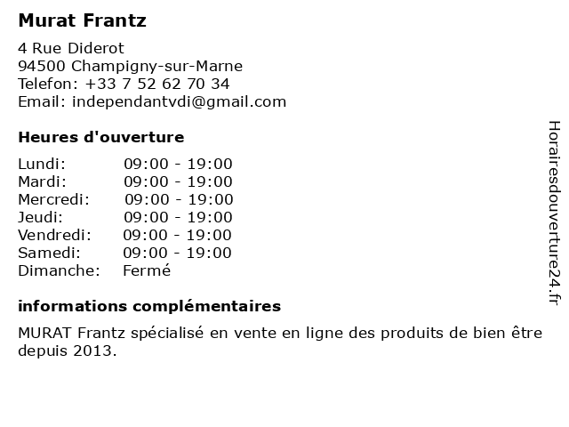 1 Murat Peintures - Rénovations (Distance: 4,71 km) 71 Rue Etienne Dolet, 94140 Alfortville murat, peintures, rénovations 2 Restaurant Le Murat (Distance: 8,99 km) 4 Place De La République, 93140 Bondy freres, le, meric, murat, restaurant, restaurants 3 Maître Chloé Frantz - Avocate (Distance: 9,97 km) 27 rue des Francs Bourgeois, 75004 Paris avocate, avocats, cabinet, chloé, conseils, contentieux, frantz, juridique, justice, litiges, maître, services 4 Menguele Serge Frantz (Distance: 11,56 km) Hot Grill, 94240 L' Hay Les Roses frantz, menguele, restaurants, serge 5 Joseph Frantz Harold (Distance: 13,66 km) 111 Avenue Du President Wilson, 93200 St Denis frantz, harold, joseph, restaurants 6 Dr Marjorie Murat - Médecin généraliste (Distance: 13,69 km) 42 Rue de la Croix Rochopt, 91860 Épinay-sous-Sénart docteur, dr, generaliste, généraliste, marjorie, medical, murat, médecin, soin |
