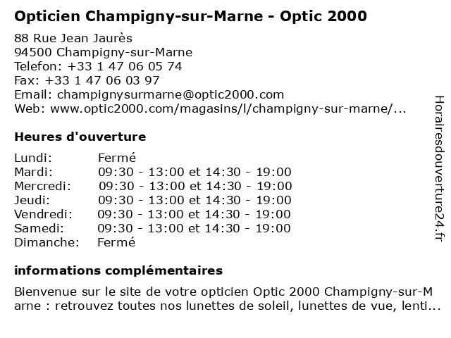 1 Optic 2000 (Distance: 0,01 km) 88 Rue Jean Jaures, 94500 Champigny Sur Marne 2000, accessoires, lentilles, lunettes, montures, optic, optic 2000, opticien, solaire, verres, vision, vue 2 OPTIC DUROC - OPTICIEN - ST MAUR (Distance: 1,98 km) 5 Avenue Foch, 94100 Saint-Maur-des-Fossés duroc, maur, optic, opticien, st 3 Opticien Joinville-le-Pont - Optic 2000 (Distance: 2,43 km) 30 Avenue du Général Gallieni, 94340 Joinville-le-Pont 2000, joinville, le, lentilles de contact, lunettes de soleil, lunettes de vue, optic, optic2000, opticien, opticien optic2000, pont, ray-ban, rayban 4 NewVision Opticien (Distance: 2,50 km) 4 Rue Baratte-Cholet, 94100 Saint-Maur-des-Fossés afflelou, aide auditive, alain, appareil auditif, newvision, opticien, prothèses auditive 5 Opticien Saint-Maur-des-Fossés - Optic 2000 (Distance: 2,67 km) 26 Rue de la Varenne, 94100 Saint-Maur-des-Fossés 2000, des, fossés, lentilles de contact, lunettes de soleil, lunettes de vue, maur, optic, optic2000, opticien, opticien optic2000, ray-ban, rayban, saint 6 |