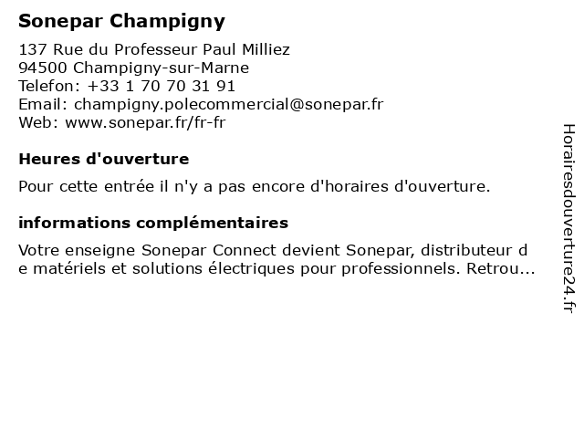 1 LMU Connect - Groupe Sonepar (Distance: 0,02 km) 137 Rue du Professeur Paul Milliez, 94500 Champigny-sur-Marne bâtiment, connect, construction, groupe, installations, lmu, services, sonepar, électricité 4 Sonepar Bussy-Saint-Martin (Distance: 10,17 km) 22 Avenue du Gué Langlois, 77600 Bussy-Saint-Martin bussy, martin, saint, sonepar 6 |