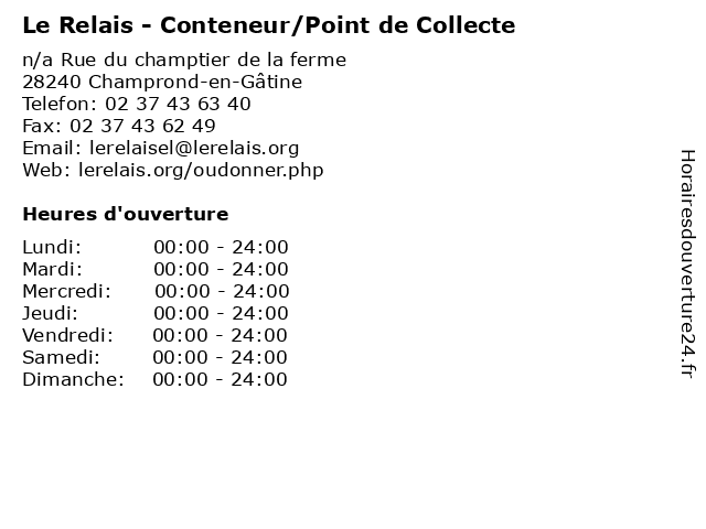 1 Le Relais - Conteneur/Point de Collecte (Distance: 1,18 km) 1 Grande Rue, 28240 Saint-Éliph collecte, conteneur/point, de, dons, le, point, relais, vêtements 2 Le Relais - Conteneur/Point de Collecte (Distance: 8,54 km) 62 Rue de l'Eglise, 28240 La Loupe collecte, conteneur/point, de, dons, le, point, relais, vêtements 3 Le Relais - Conteneur/Point de Collecte (Distance: 8,73 km) - Rue de l'Abreuvoir, 28240 La Loupe collecte, conteneur/point, de, dons, le, point, relais, vêtements 4 Le Relais - Conteneur/Point de Collecte (Distance: 10,85 km) - Rue du Marquis d'Aligre, 28190 Pontgouin collecte, conteneur/point, de, dons, le, point, relais, vêtements 5 Le Relais - Conteneur/Point de Collecte (Distance: 11,19 km) 19 Rue de l'Abbaye, 28240 Belhomert-Guéhouville collecte, conteneur/point, de, dons, le, point, relais, vêtements 6 Le Relais - Conteneur/Point de Collecte (Distance: 16,17 km) 6 Rue Jean Moulin, 28250 Digny collecte, conteneur/point, de, dons, le, point, relais, vêtements |