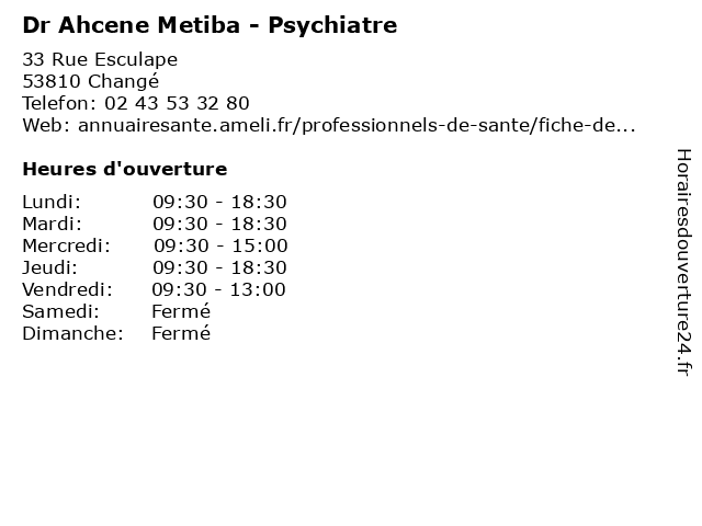 1 Dr Michael Sikorav - Psychiatre (Distance: 0,01 km) 33 Rue Esculape, 53810 Changé dr, michael, psy, psychiatre, sante, sikorav, soins 2 Dr Thomas Landelle - Psychiatre (Distance: 3,23 km) 19 Boulevard Félix Grat, 53000 Laval dr, folie, landelle, psychiatre, psychiatrie, psychiatrique, thomas 3 Dr Nathalie Hulo - Psychiatre (Distance: 3,67 km) 33 rue du Haut Rocher, 53000 Laval consultation, docteur, dr, hulo, med, médecin, médecine, nathalie, psychiatre, traitement 4 Dr Pascale Delafond - Psychiatre (Distance: 3,67 km) 33 rue du Haut Rocher, 53000 Laval consultation, delafond, docteur, dr, med, médecin, médecine, pascale, psychiatre, traitement 5 Dr Frikia Djebbar - Psychiatre (Distance: 3,67 km) 33 rue du Haut Rocher, 53000 Laval consultation, djebbar, docteur, dr, frikia, med, médecin, médecine, psychiatre, traitement 6 Dr Sabine Fosse - Psychiatre (Distance: 3,67 km) 33 rue du Haut Rocher, 53000 Laval consultation, docteur, dr, fosse, med, médecin, médecine, psychiatre, sabine, traitement |