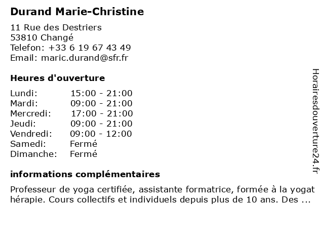 1 Dr Marie-Christine Leveleux-Chichery - Médecin du travail (Distance: 1,93 km) 51 rue du Chef de Bataillon Henri Géret, 53000 Laval chichery, christine, consultation, docteur, dr, du, leveleux, marie, med, médecin, traitement, travail 2 Gasseau Christine (Distance: 4,95 km) 12 Rue Maurice Courcelle, 53240 Saint-Jean-sur-Mayenne christine, gasseau 4 Bar Tabac Restaurant De La Ferme De Bras (Distance: 26,66 km) Madame Vanessa Guerrois, 53100 Mayenne bar, boissons, bras, christine, débits, ferme, georgette, guerrois, restaurant, tabac, vanessa 6 Coret Menant Christine (Distance: 35,01 km) 19 Place Du General Barrabe, 53120 Gorron christine, coret, menant, restaurants |