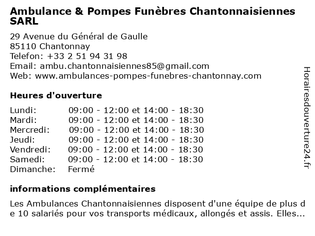 1 Pompes Funèbres Brémand Funéraire (Distance: 1,12 km) 63 Avenue de Lattre de Tassigny, 85110 Chantonnay brémand, funèbres, funéraire, pompes 2 Ambulance Chantonnaisienne (Distance: 6,20 km) 1 Rue Henri Adolphe Archereau, 85480 Saint-Hilaire-le-Vouhis ambulance, chantonnaisienne 3 Ambulances Chantonnaisiennes (Distance: 10,28 km) 27 Rue des Vieux Métiers, 85390 Chavagnes-les-Redoux ambulances, chantonnaisiennes 4 Pompes Funèbres Faivre SARL (Distance: 11,26 km) 5 Beauregard, 85480 Bournezeau faivre, funèbres, pompes, sarl 5 Pompes funèbres et Marbrerie Luc SOULARD (Distance: 14,45 km) 15 Rue Eugène Charrier, 85510 Le Boupère et, funèbres, luc, marbrerie, pompes, soulard 6 Brémand Pompes Funèbres (Distance: 14,89 km) 101 Route de Nantes, 85210 Sainte-Hermine brémand, funèbres, pompes |