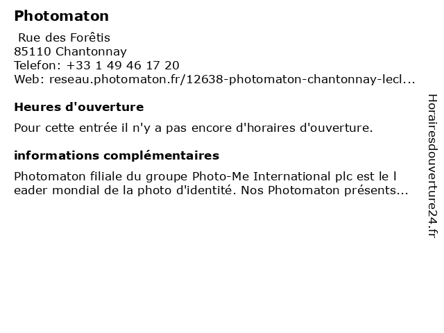 1 Photomaton (Distance: 2,18 km)45 Avenue Georges Clemenceau, 85110 Chantonnay photomaton