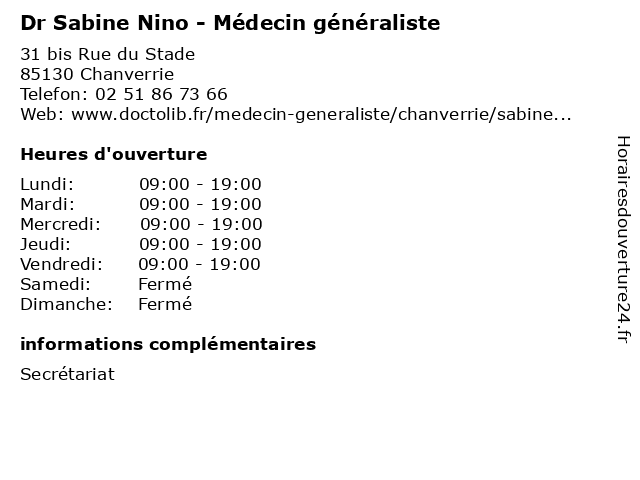 1 Dr Sabine Naour-Leroy - Médecin généraliste (Distance: 26,72 km) 7 Rue du Docteur Doussin, 44190 Clisson consultation, docteur, dr, généraliste, leroy, med, médecin, médecine, naour, sabine, secrétariat, traitement 2 Ngoua Mba Carine Sabine (Distance: 36,28 km) Breuil Chaussee, 79300 Bressuire carine, mba, ngoua, restaurants, sabine 3 Dr Sabine Peillon - Médecin généraliste (Distance: 47,71 km) 160 Rue du Verger, 44150 Ancenis consultation, docteur, dr, généraliste, med, medecine, medical, médecin, peillon, sabine, traitement 4 Sabine Pons Bredard - Diététicienne (Distance: 48,83 km) 9 Boulevard François Blancho, 44200 Nantes aliment, bredard, dieticien, diététicienne, medecin, nutrition, pons, sabine 5 Dr Sabine Dechauffour - Radiologue (Distance: 49,18 km) 4 Rue Eric Tabarly, 44200 Nantes consultation, dechauffour, docteur, dr, med, médecin, radiologue, sabine, traitement 6 Sabine Mangeot - Sage-femme (Distance: 50,25 km) 38 boulevard Jean-Monnet, 44000 Nantes consultation, docteur, dr, femme, mangeot, med, médecin, sabine, sage, traitement |