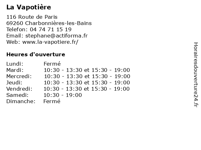 | Vendredi | 10:30-13:30 et 15:30-19:00 |