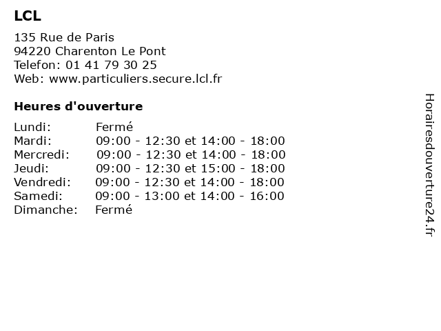 3 LCL (Distance: 1,45 km) 65 Avenue Du General De Gaulle, 94700 Maisons Alfort banque, crédit, lcl, service 4 LCL (Distance: 1,51 km) 74 Avenue Du General De Leclerc, 94700 Maisons Alfort banque, crédit, lcl, service 6 LCL (Distance: 1,63 km) 88 Avenue Du General De Gaulle, 94160 Saint Mande banque, crédit, lcl, service |