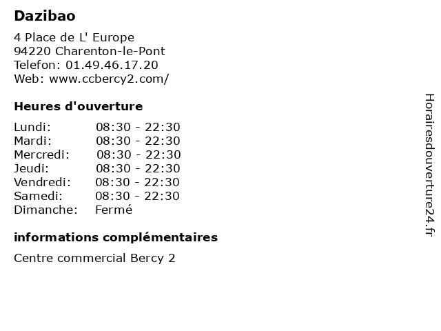 | Samedi | 08:30-22:30 |