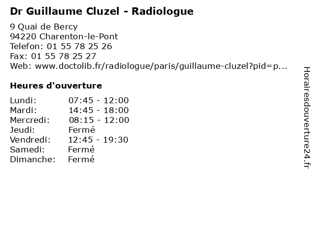 1 Dr Guillaume Cluzel - Radiologue (Distance: 2,78 km) 134 Boulevard Diderot, 75012 Paris cluzel, dr, guillaume, médecin, médecine, médical, pharmaceutique, radiologue, secretariat, traitement 2 Dr Guillaume Cluzel - Radiologue (Distance: 3,54 km) 78 Avenue du Général Leclerc, 94270 Le Kremlin-Bicêtre cluzel, consultation, docteur, dr, guillaume, med, médecin, médecine, radiologue, traitement 3 Dr Guillaume Cluzel - Radiologue (Distance: 3,64 km) 28 Rue de Charenton, 75012 Paris cluzel, consultation, docteur, dr, guillaume, med, médecin, radiologue, traitement 4 Maître Guillaume Delord - Avocat (Distance: 1,65 km) 61 rue de Bercy, 75012 Paris avocat, avocats, cabinet, conseils, contentieux, delord, guillaume, juridique, justice, litiges, maître, services 5 Maître Guillaume Delord - Avocat (Distance: 1,65 km) 61 Rue de Bercy, 75012 Paris avocat, delord, guillaume, justice, lois, maitre, maître 6 Guillaume Raimbault Psychologue clinicien Psychanalyste (Distance: 1,86 km) 105 Avenue du Général Michel Bizot, 75012 Paris clinicien, guillaume, psychanalyste, psychologue, raimbault |