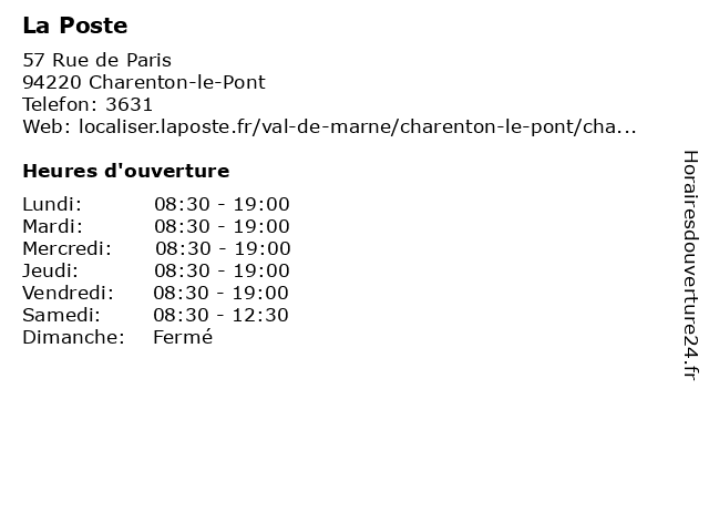 1 La Poste (Distance: 0,14 km) 23 Rue du Marechal Leclerc, 94410 Saint Maurice agence, colis, courriers, expédition, la, postale, poste, relais 2 La Poste (Distance: 1,53 km) - Place Salvador Allende, 94140 Alfortville colis, express chronopost, expédition, la, poste, réexpédition internationale, service, suivi du courrier 3 La Poste (Distance: 2,07 km) 4 Place de l'Europe, 94220 Charenton le Pont colis, express chronopost, expédition, la, poste, réexpédition internationale, service, suivi du courrier 4 La Poste (Distance: 2,46 km) 6 Rue Jeanne d'Arc, 94160 Saint-Mandé colis, express chronopost, expédition, la, poste, réexpédition internationale, service, suivi du courrier 5 La Poste (Distance: 2,90 km) 3 Rue Fragonard, 94410 Saint Maurice colis, express chronopost, expédition, la, poste, réexpédition internationale, service, suivi du courrier 6 La Poste (Distance: 3,22 km) 18 Avenue du Château, 94300 Vincennes colis, express chronopost, expédition, la, poste, réexpédition internationale, service, suivi du courrier |