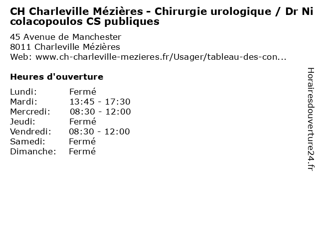 1 CH Charleville Mézières - Chirurgie urologique / Dr Nicolacopoulos CS privées (Distance: 0,00 km) 45 Avenue de Manchester, 08011 Charleville Mézières bureau, ch, charleville, chirurgie, consultation, cs, dr, maladie, med, médecin, médecine, mézières, nicolacopoulos, pratique, privées, thérapie, traitement, urologique 2 CH Charleville Mézières - Chirurgie urologique / Dr Riquet CS publiques (Distance: 0,00 km) 45 Avenue de Manchester, 08011 Charleville Mézières bureau, ch, charleville, chirurgie, consultation, cs, dr, maladie, med, médecin, médecine, mézières, pratique, publiques, riquet, thérapie, traitement, urologique 3 CH Cedan - Consultations externes de chirurgie / service (Distance: 18,26 km) 2 Avenue Margueritte, 08209 Sedan bureau, cedan, ch, chirurgie, consultation, consultations, de, dr, externes, maladie, med, médecin, médecine, pratique, service, thérapie, traitement 4 CH Cedan - chirurgie orthopédique et traumatologique / visites (Distance: 18,26 km) 2 Avenue Margueritte, 08209 Sedan bureau, cedan, ch, chirurgie, consultation, dr, et, maladie, med, médecin, médecine, orthopédique, pratique, thérapie, traitement, traumatologique, visites 5 CH Cedan - chirurgie viscérale et urologique / visites (Distance: 18,26 km) 2 Avenue Margueritte, 08209 Sedan bureau, cedan, ch, chirurgie, consultation, dr, et, maladie, med, médecin, médecine, pratique, thérapie, traitement, urologique, viscérale, visites 6 CH Cedan - chirurgie ambulatoire / consultations (Distance: 18,26 km) 2 Avenue Margueritte, 08209 Sedan ambulatoire, bureau, cedan, ch, chirurgie, consultation, consultations, dr, maladie, med, médecin, médecine, pratique, thérapie, traitement |